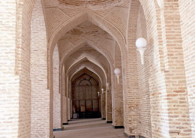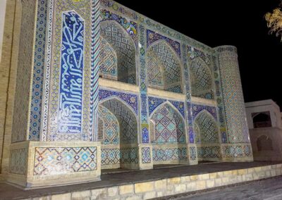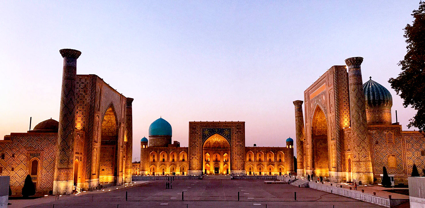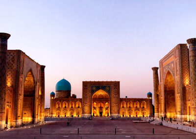 Samarcanda, la città più importante lungo la Via della Seta, ospita un importante esempio di architettura islamica: il Registan, una piazza delimitata da tre scuole religiose decorate con ricchi mosaici e risalenti ai secoli XV-XVII.